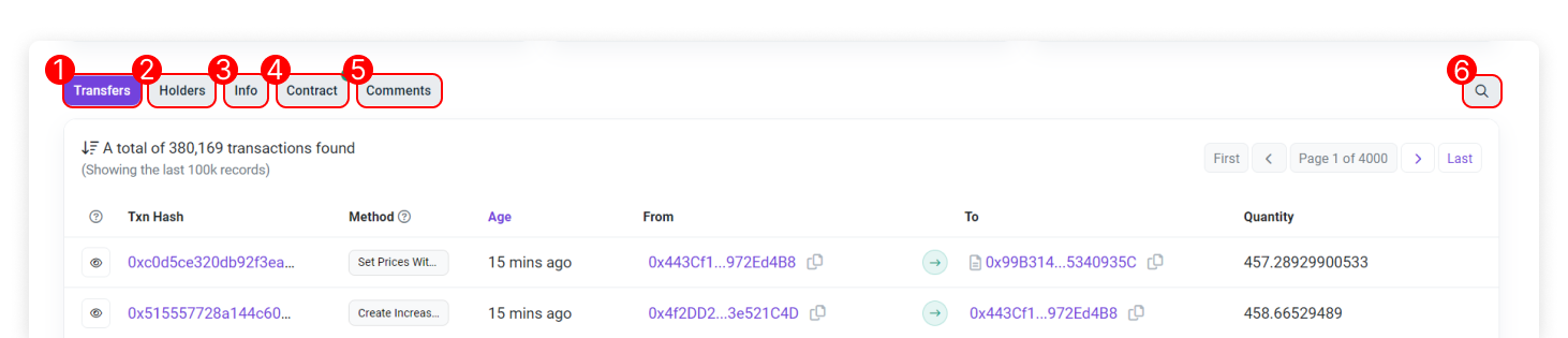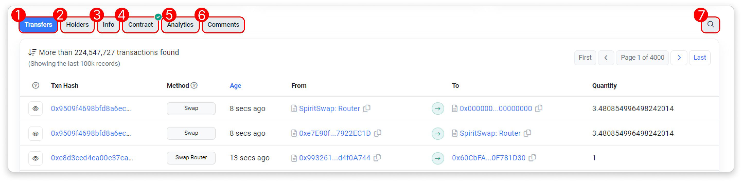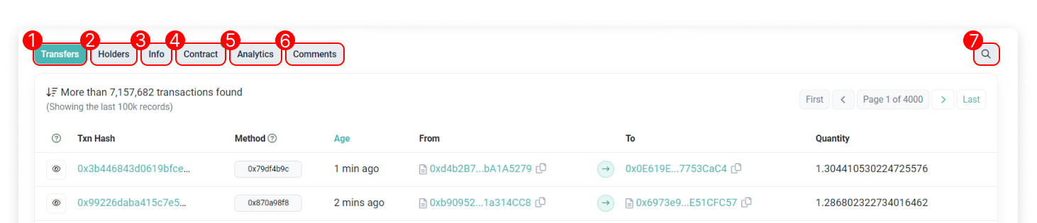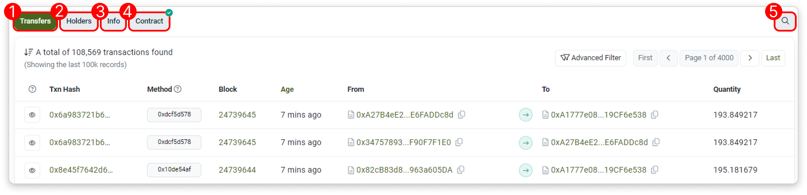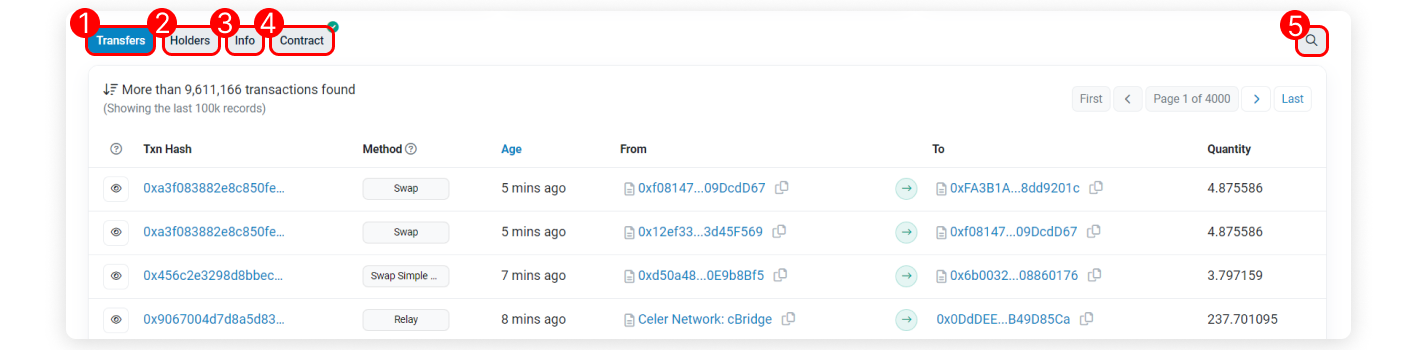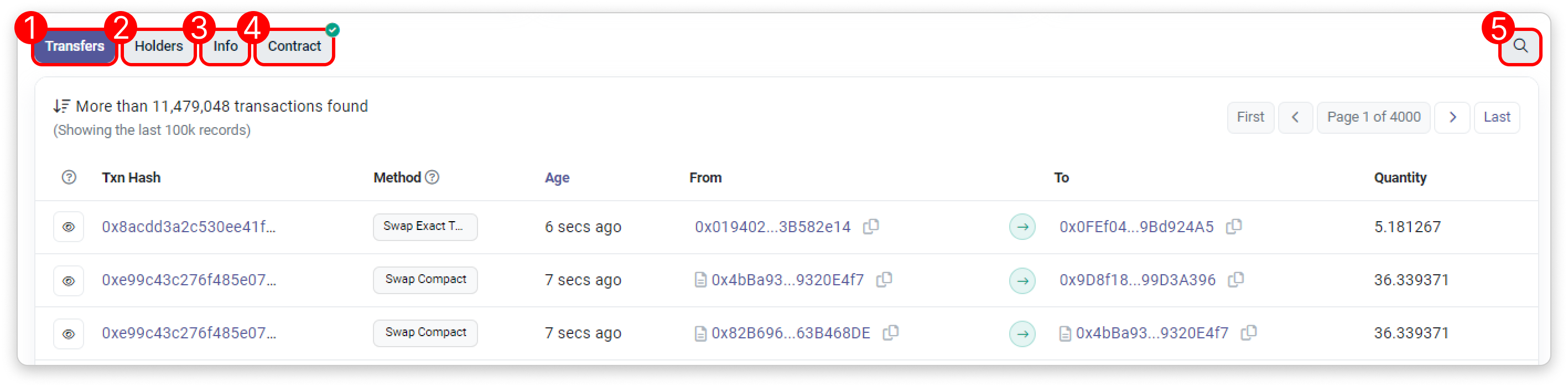 - Transfers: This tab shows all of the token's transfer event in chronological order.