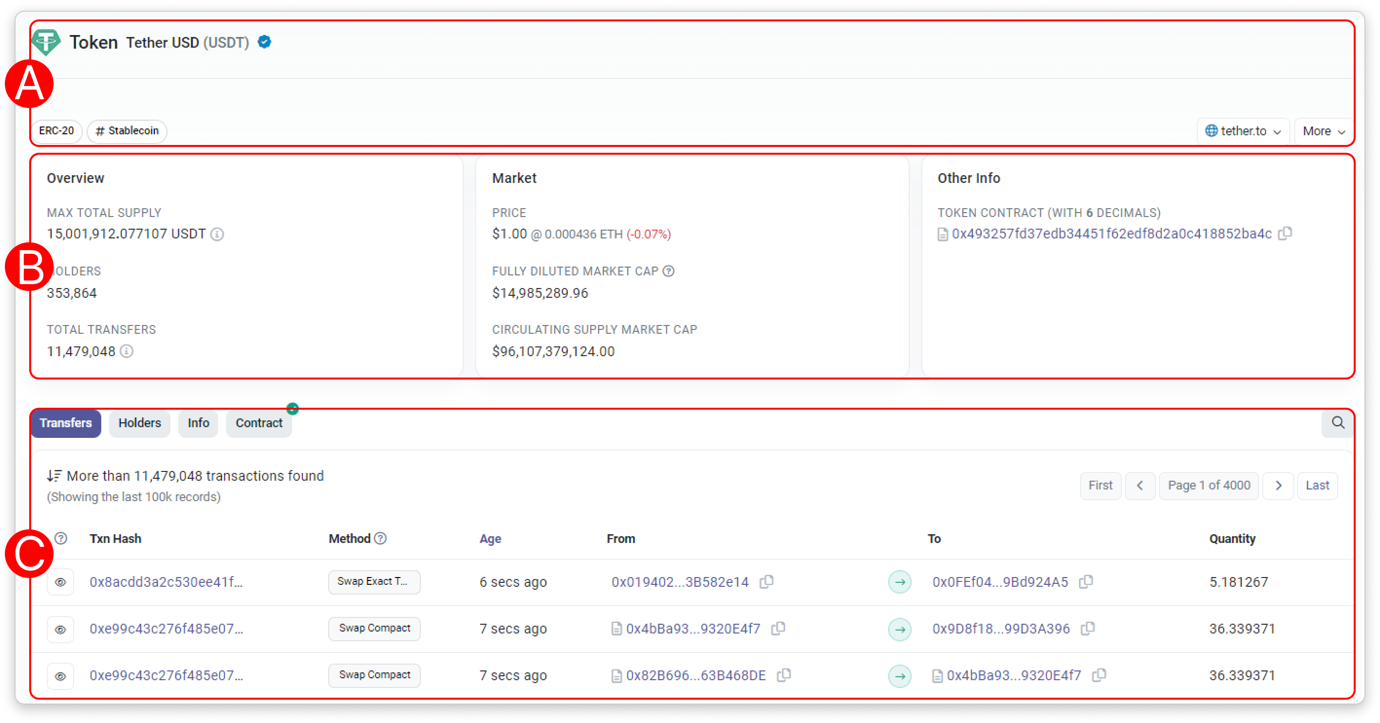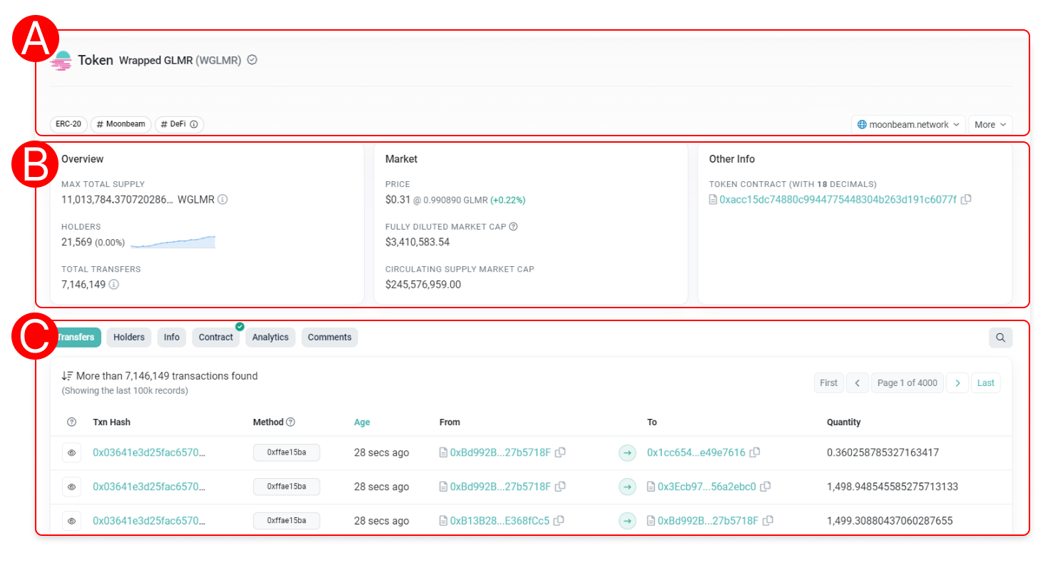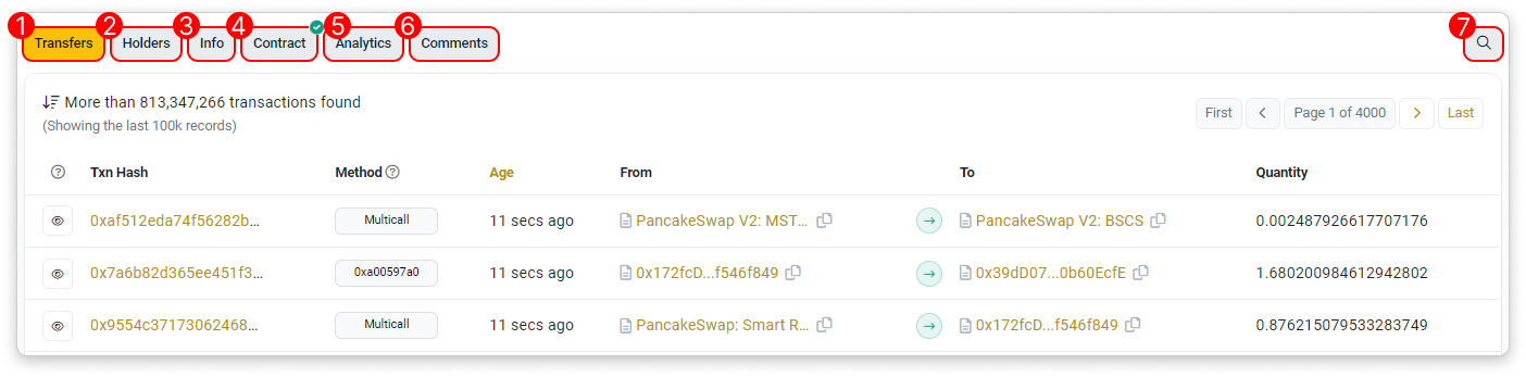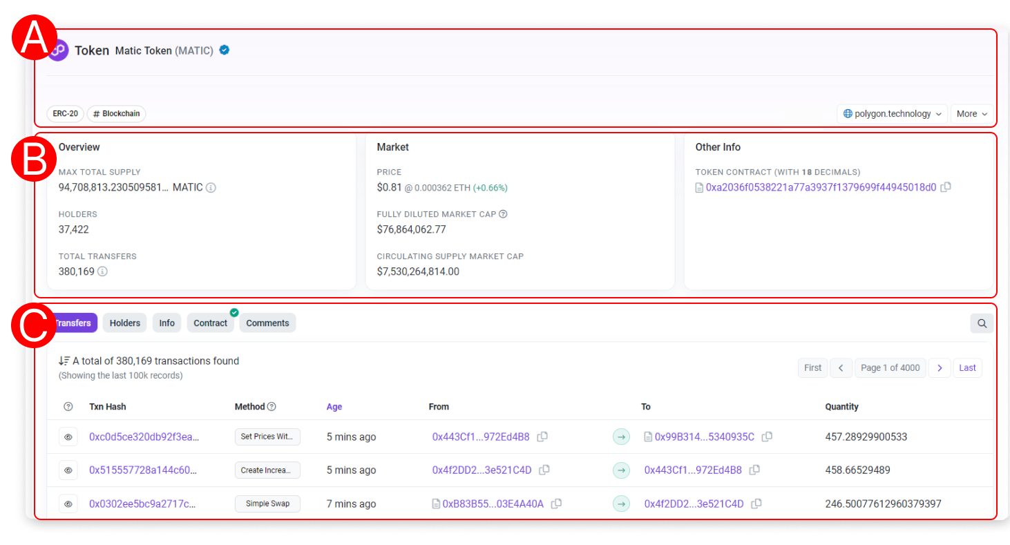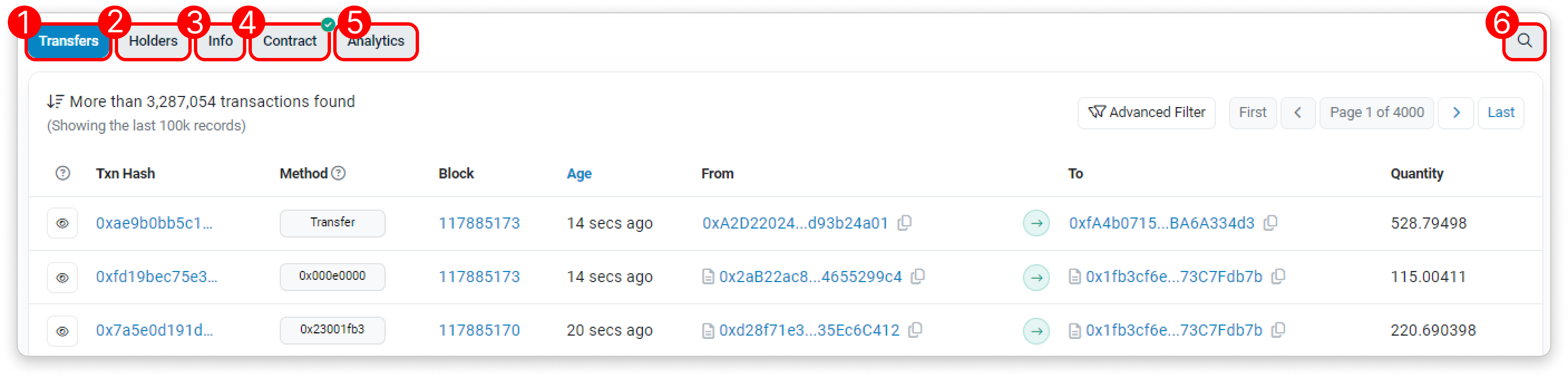 - Transfers: This tab shows all of the token's transfer event in chronological order.