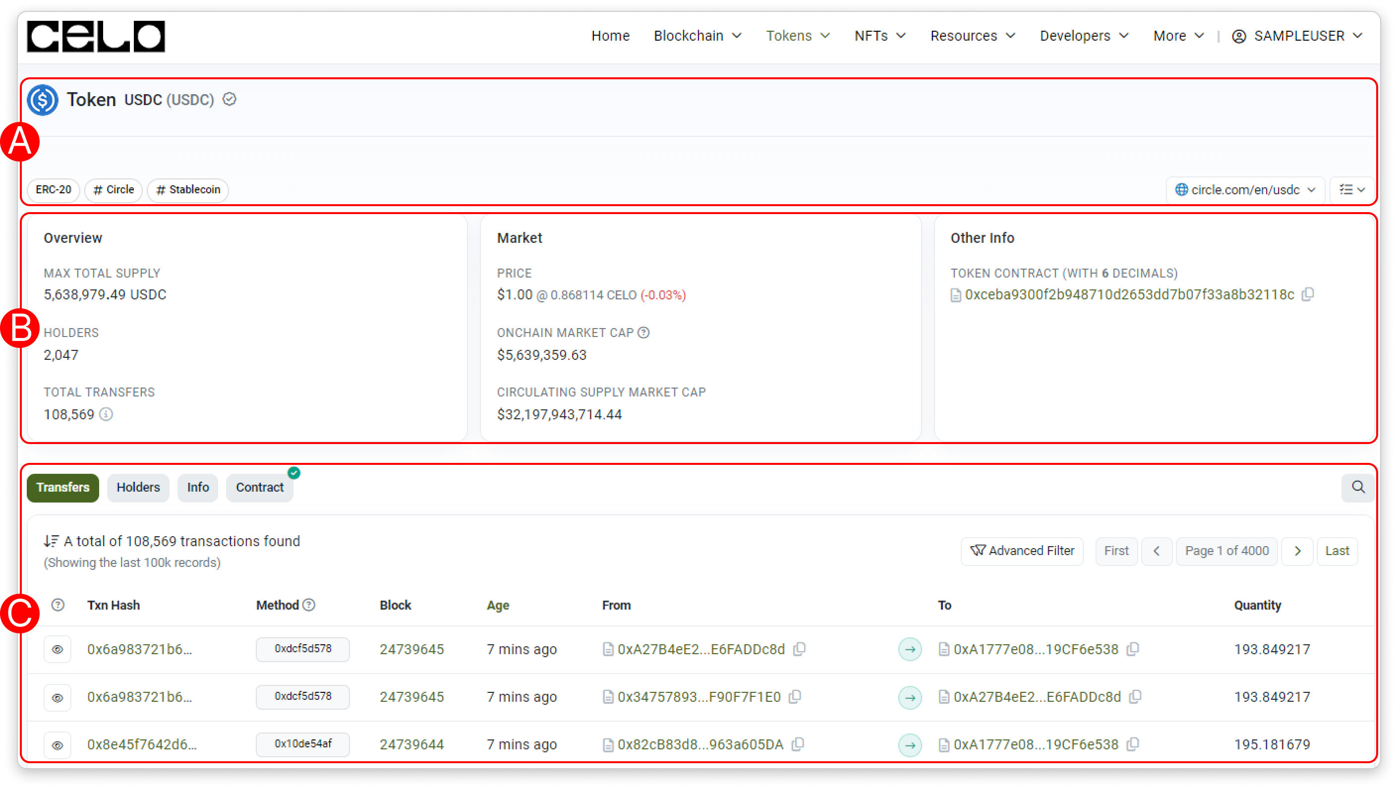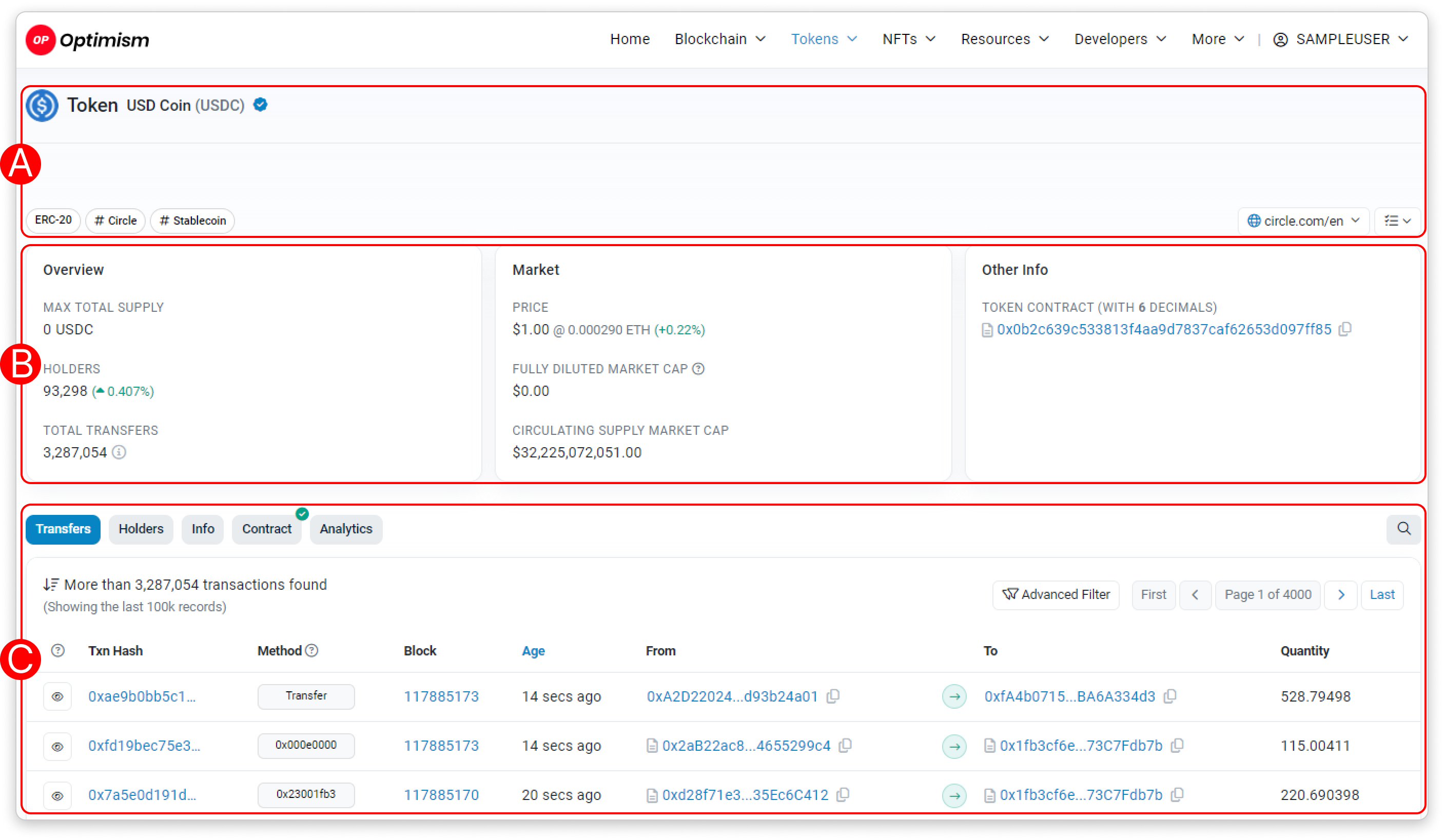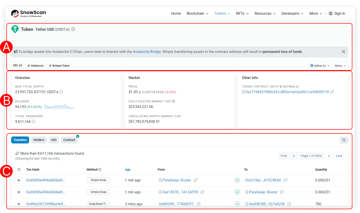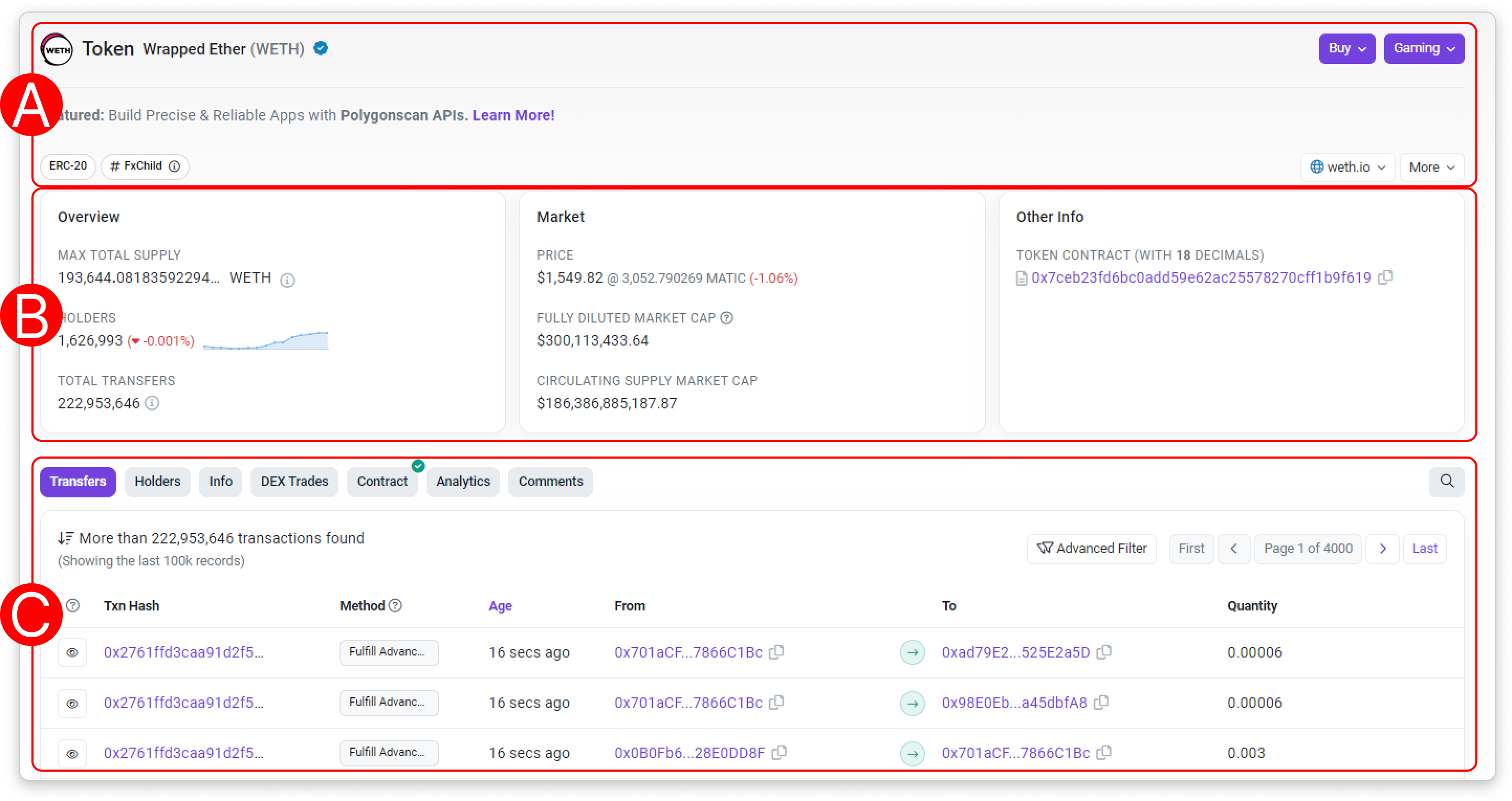 - Transfers: This tab shows all of the token's transfer event in chronological order.