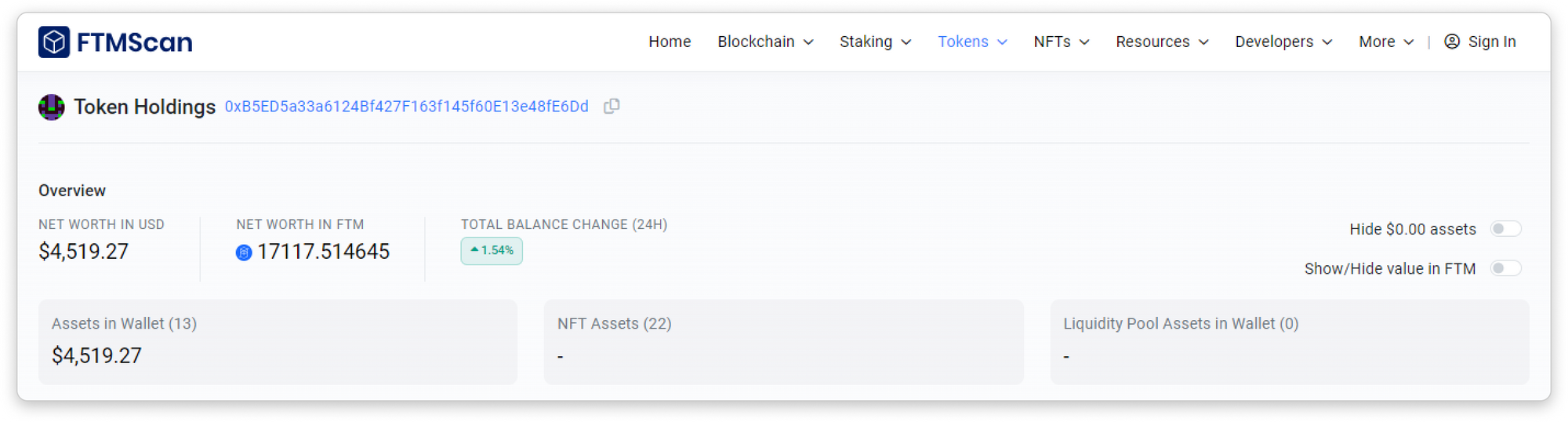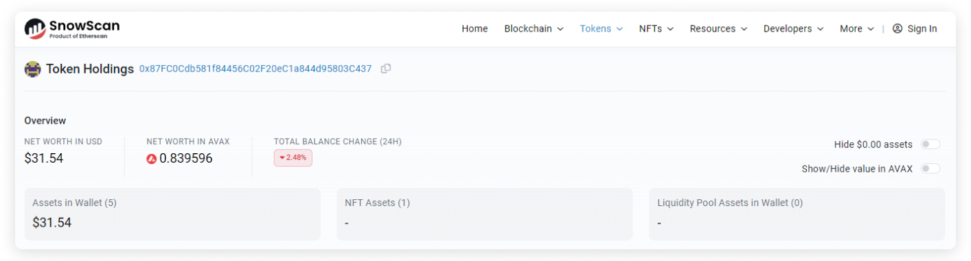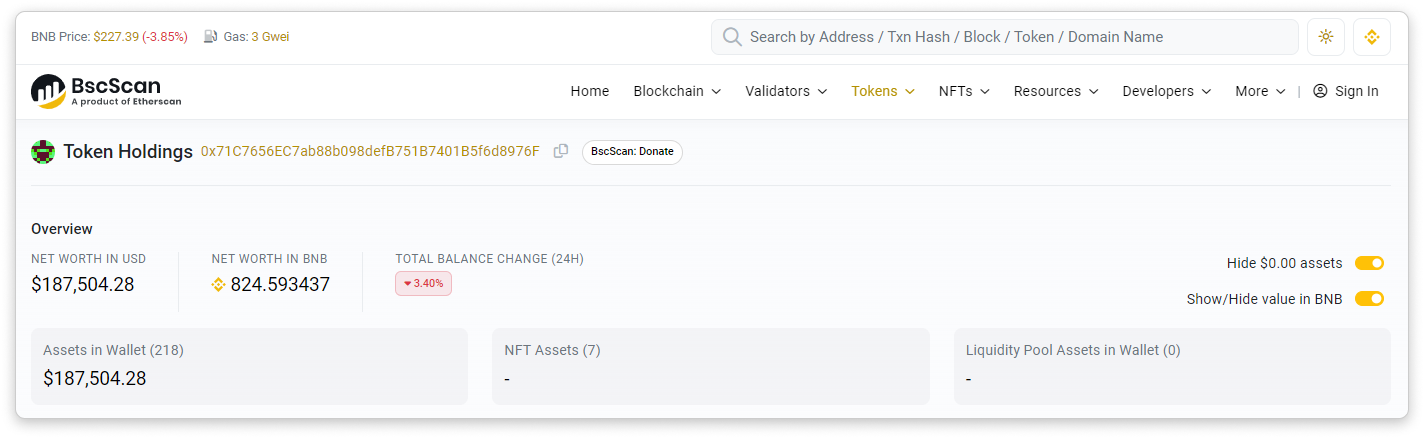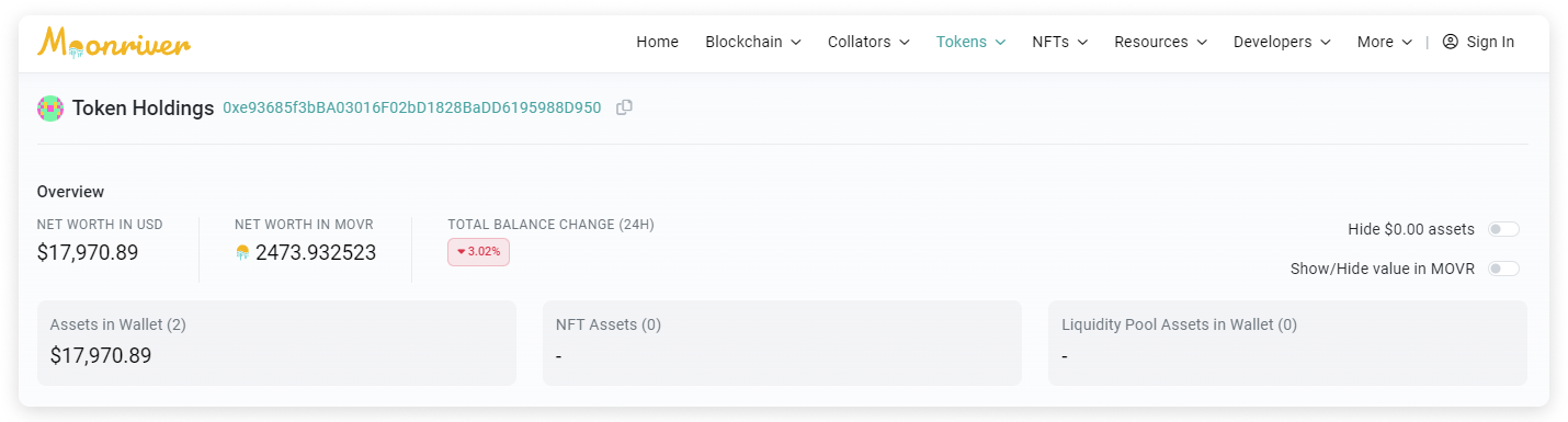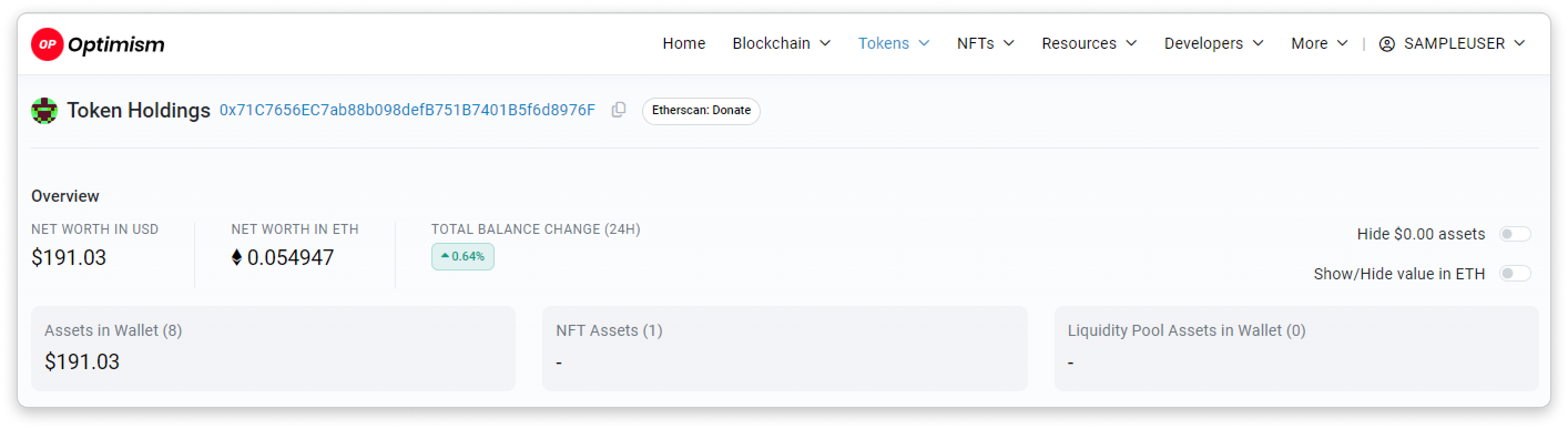 In the Token Holdings page, you may check an address's net worth (in USD or ETH). You may also choose to hide $0.00 assets and to show/hide value in ETH using the toggle located at the top right section.