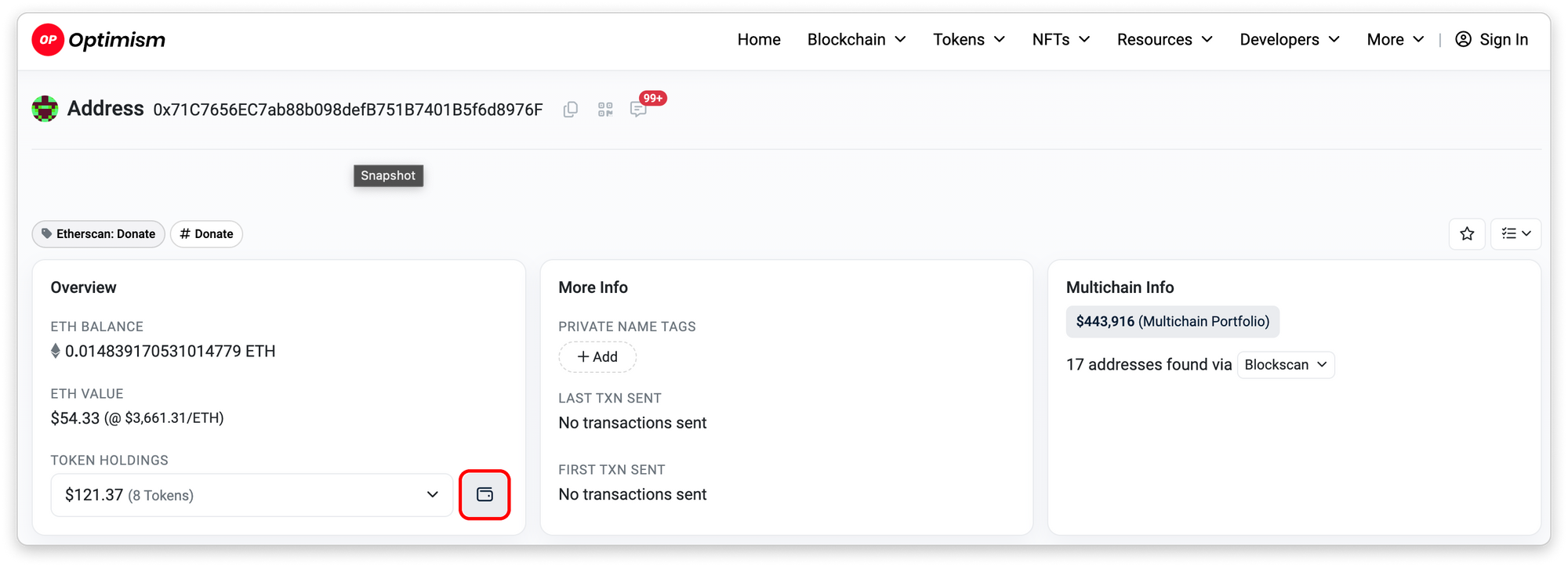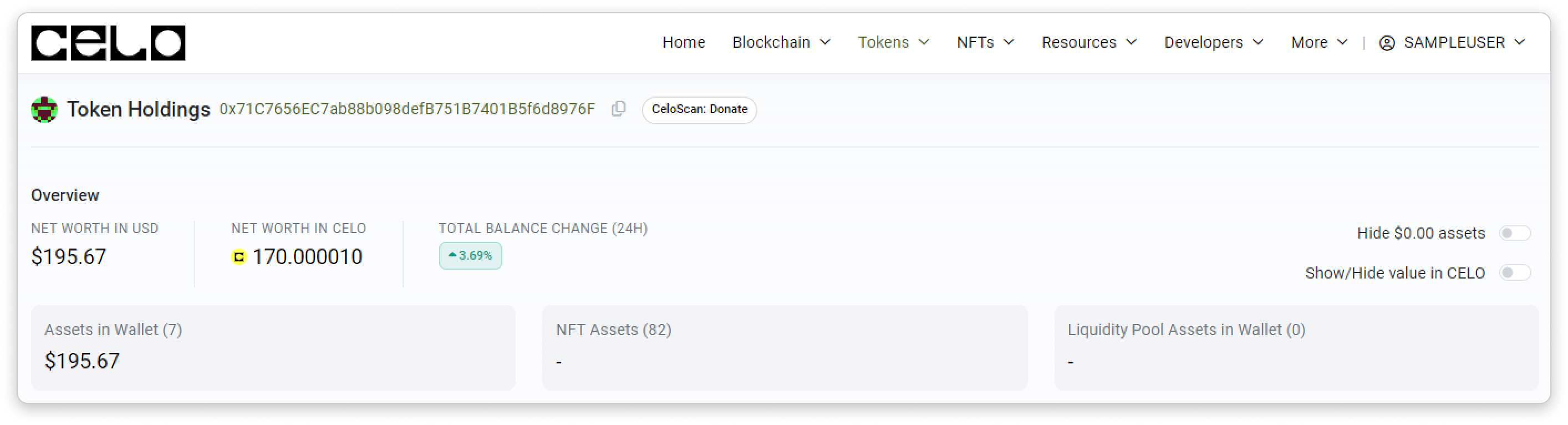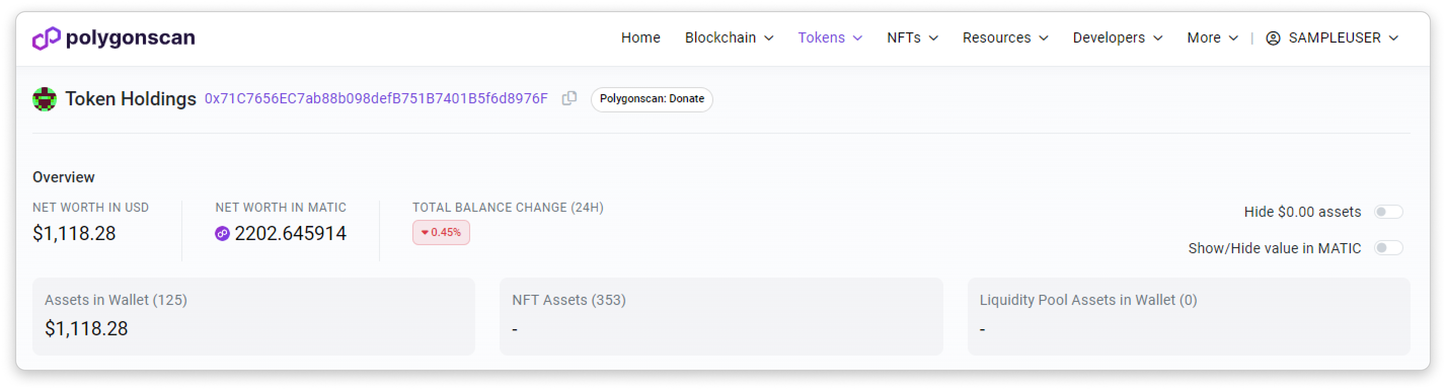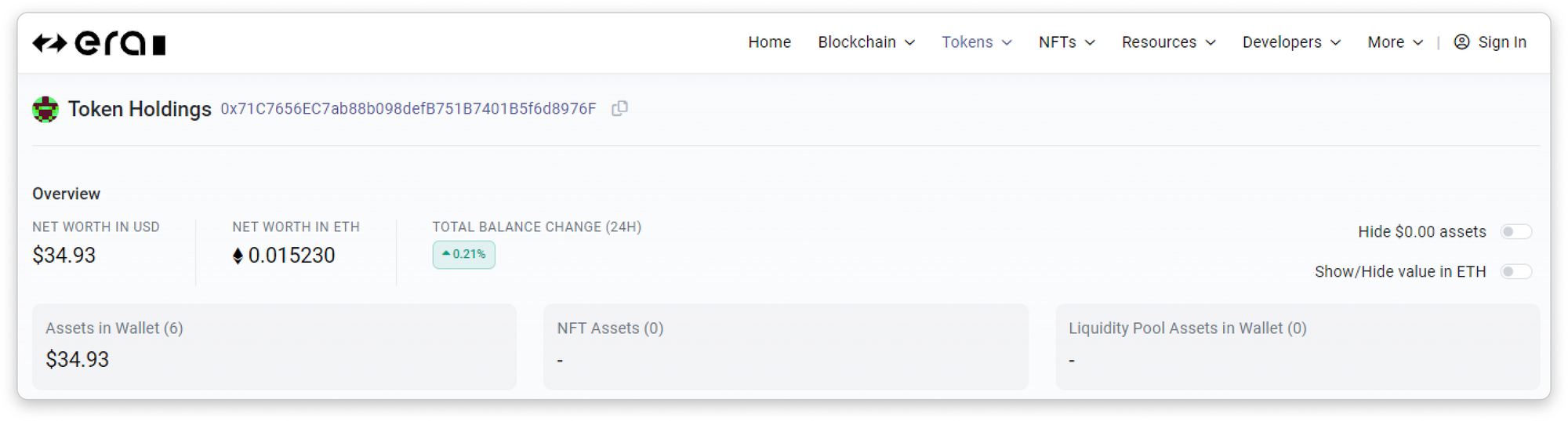 In the Token Holdings page, you may check an address's net worth (in USD or ETH). You may also choose to hide $0.00 assets and to show/hide value in ETH using the toggle located at the top right section.